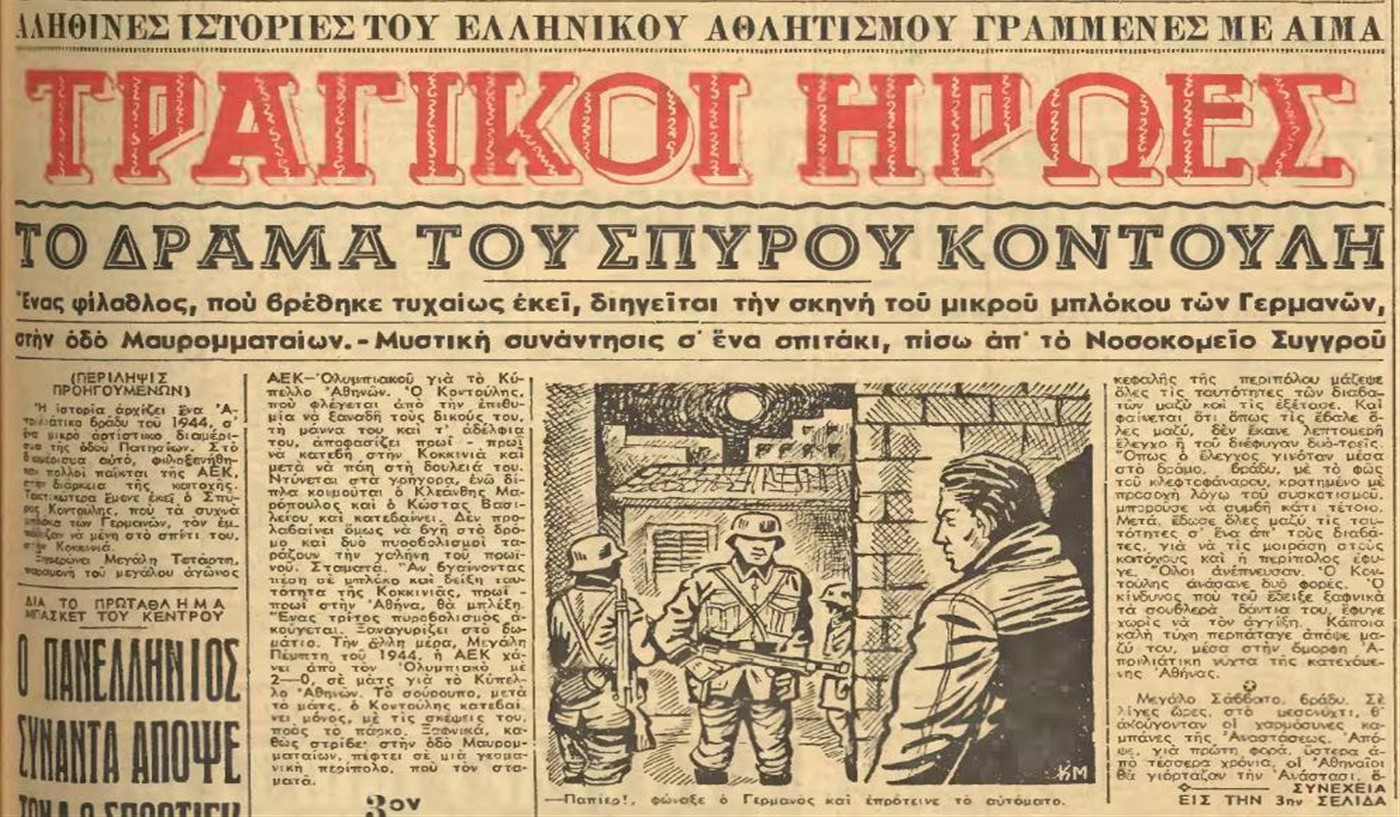 8. Σημαντικό ντοκουμέντο από τη συλλογή του Μουσείου Ιστορίας της ΑΕΚ: η εφημερίδα Αθλητισμός της 24ης Απριλίου 1944, με το ρεπορτάζ από τον αγώνα ΑΕΚ – ΠΑΟ 2-1. Τον τελευταίο αγώνα που έπαιξε ο Σπύρος Κοντούλης, που περιγράφεται εκτενώς στο κείμενο του Μίμη Παπαναγιώτου. Την επομένη συνελήφθη από τους Γερμανούς.