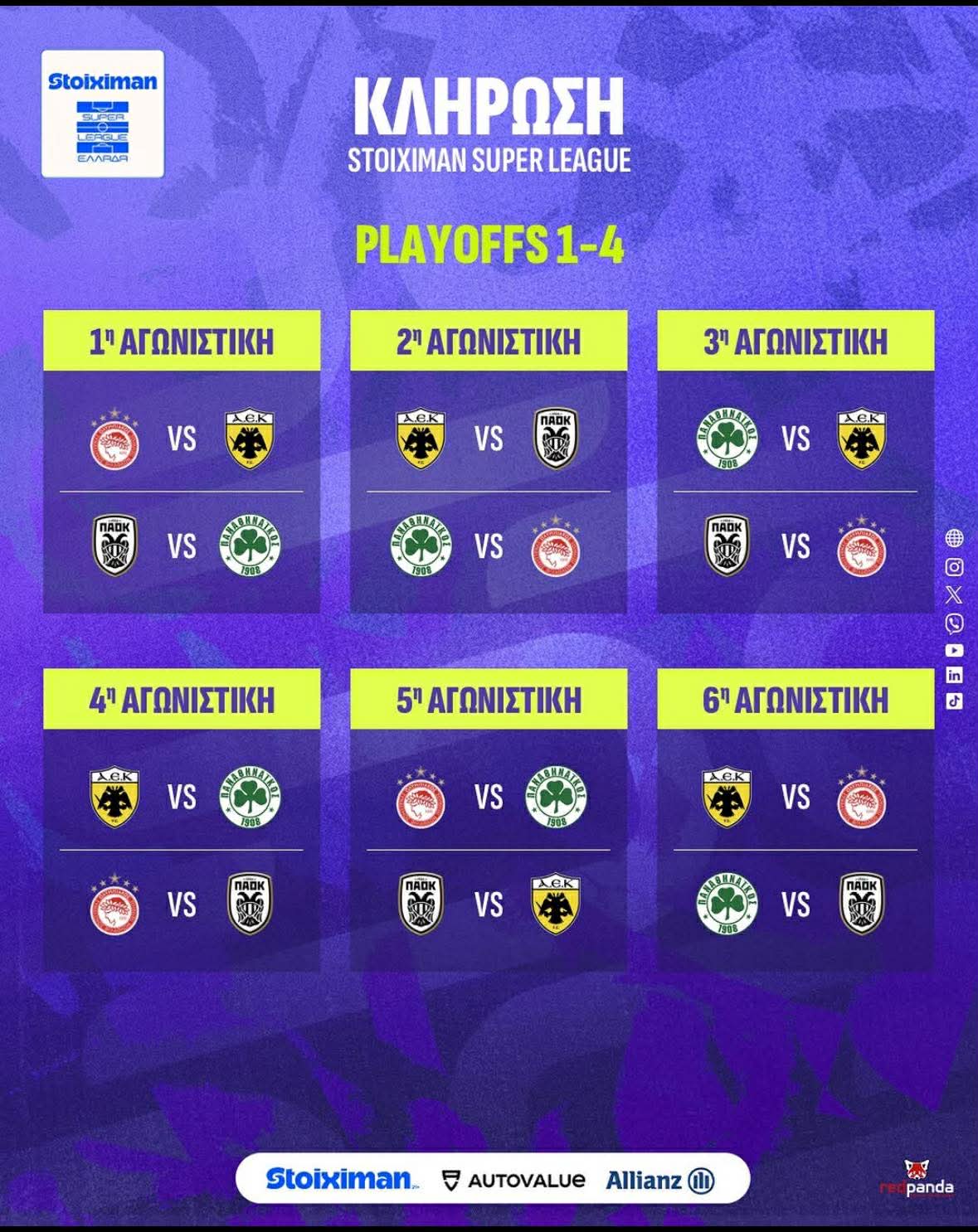 Για την 2η αγωνιστική υποδέχεται τον ΠΑΟΚ και στη στη συνέχεια αγωνίζεται με τον Παναθηναϊκό στη Λεωφόρο. Την 4η αγωνιστική φιλοξενεί τους πράσινους, την 5η ταξιδεύει στην Τούμπα και κλείνει τη διαδικασία των πλέι οφ στην Νέα Φιλαδέλφεια απέναντι στον Ολυμπιακό.