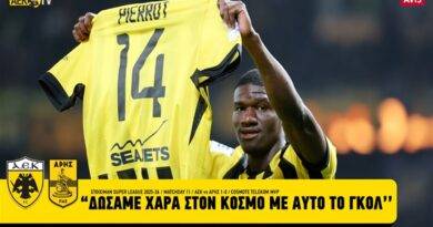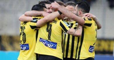 Έξαλλοι πανηγυρισμοί του Λάζαρου Ρότα μετά το διπλό της ΑΕΚ στο “Γ. Καραϊσκάκης”.