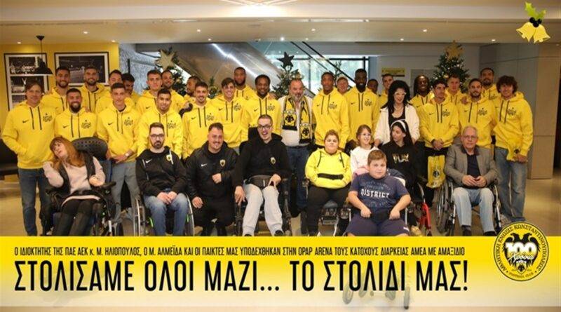 Ο ιδιοκτήτης της ΠΑΕ ΑΕΚ κ. Μάριος Ηλιόπουλος, ο Ματίας Αλμέιδα και οι παίκτες μας υποδέχθηκαν στην OPAP Arena τους κατόχους διαρκείας ΑΜΕΑ με αμαξίδιο και στόλισαν όλοι μαζί το Χριστουγεννιάτικο δέντρο!